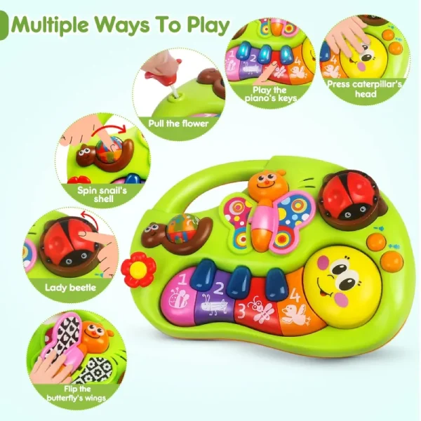 Jucarie muzicala sub forma unei omizi zambitoare cu cinci taste de pian ii incurajeaza pe copii sa exploreze muzica.