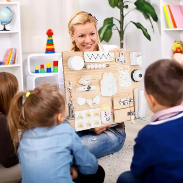 Placa busy board face parte din gama de jucarii Montessori ca material didactic pentru educatie timpurie.