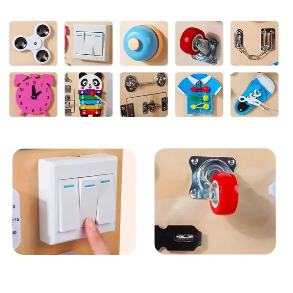 Inspirată de metodologia Montessori, această placa busy board captivantă oferă o experiență educativă și interactivă remarcabilă.
