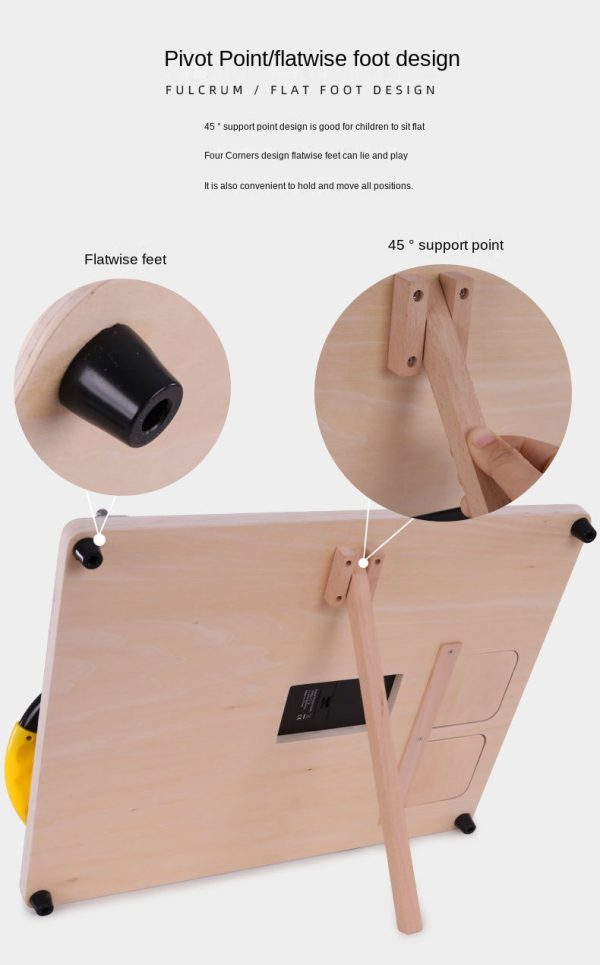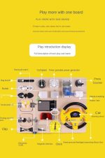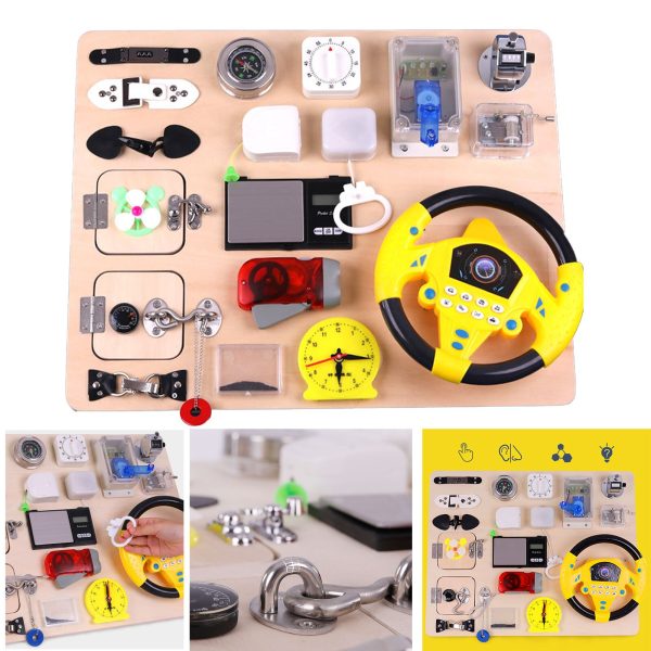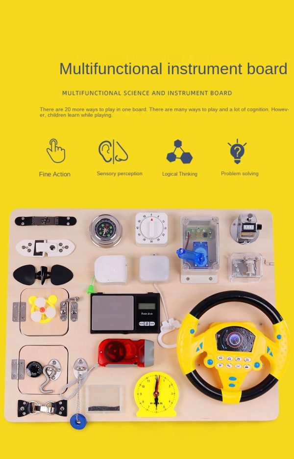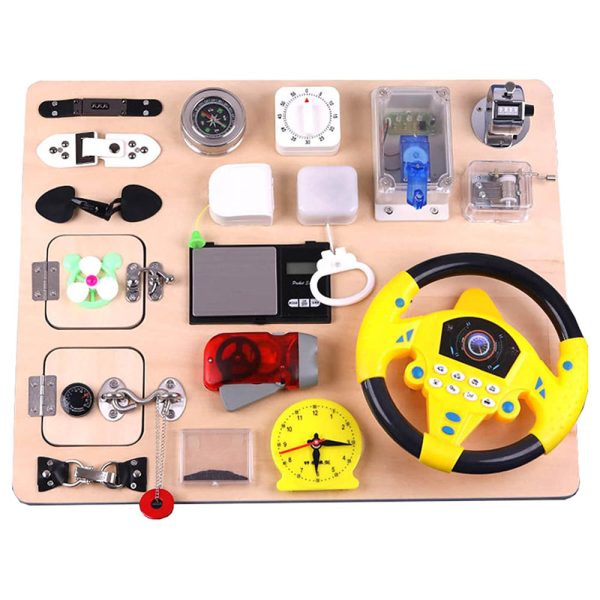 Tabla include elemente precum butoane, încuietori,cantar,busole,ceas, un volan și multe altele, astfel încât copiii să poată explora și învăța prin joacă.
