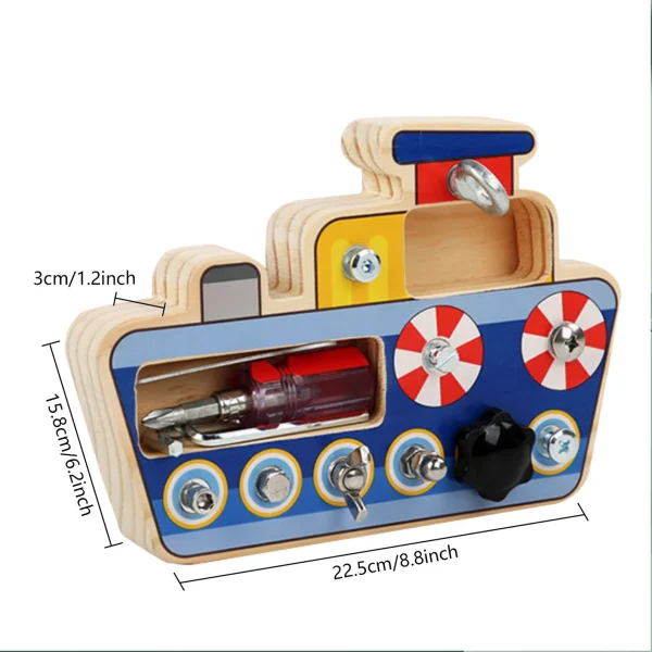 Placa Montessori Vaporasul cu Scule Lemn face parte din pedagogia Montessori,ca material didactic,pentru educatie timpurie.