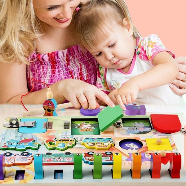 Tabla busy board contine elemente care reprezinta provocările obișnuite ale vieții, astfel încât copiii să învețe abilități practice în timp ce se joacă.
