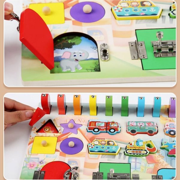 Tabla busy board include uși deschise, încuietori de deblocare, încuietori pop, 6 puzzle-uri de transport, 4 grafice cu diferite forme, o undiță și 10 pești mici, printre alte caracteristici.