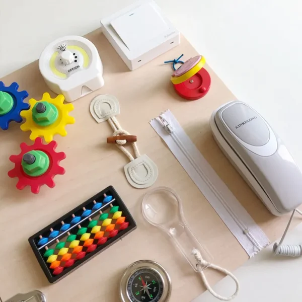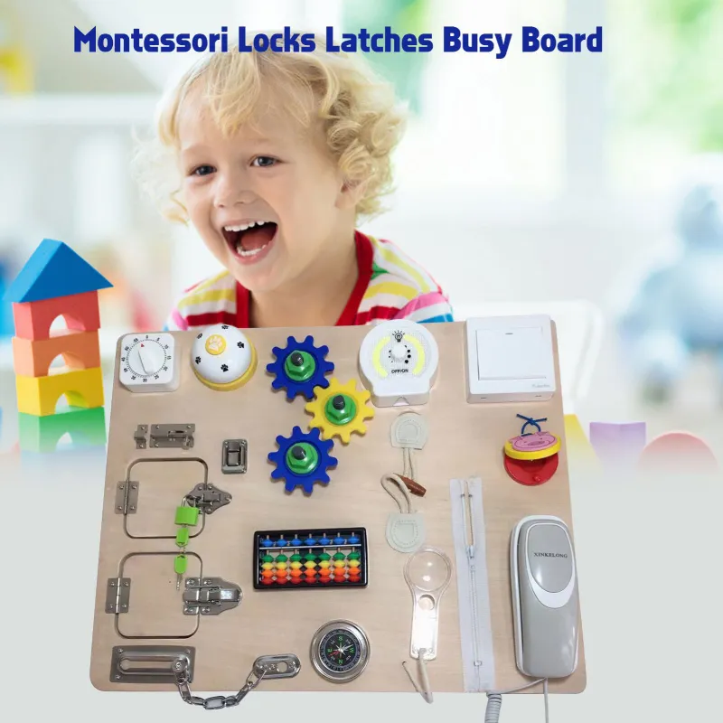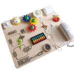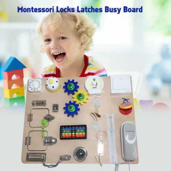 Placa Senzoriala Montessori cu Activitati BusyBoard face parte din gama de jucarii Montessori ca material didactic pentru educatie timpurie.