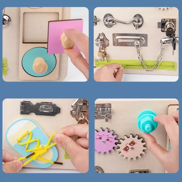 Placa Senzoriala Montessori cu Activitati Educative dezvolta abilitatile vizuale si cognitive.