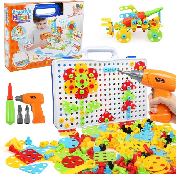 Cu ajutorul burghiului atașat setului puteți înșuruba elementele în și afară, creând diverse modele.