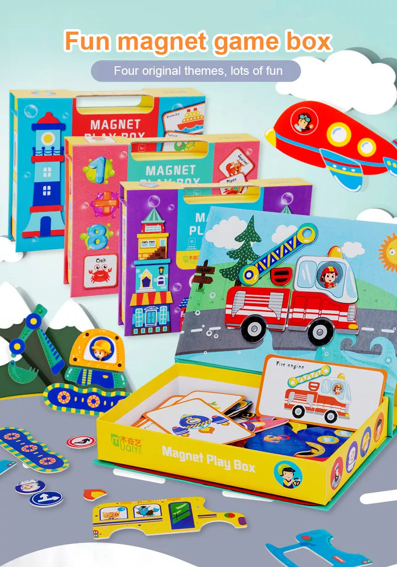 Puzzle Educativ Carte Magnetica Carton 4 Jocuri contine carduri cu imagini si piese magnetice.