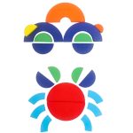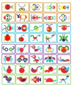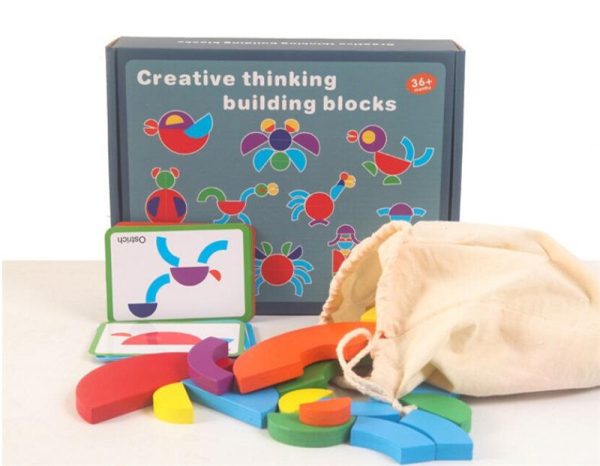 Jocul include 32 piese din lemn de diverse forme si culori, 20 de carticele cu 40 de ilustratii pe ambele fete de creat.