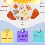 - Butoane interactive – Fiecare buton îl invită pe cel mic să exploreze și să descopere noi sunete și melodii, dezvoltându-i curiozitatea și abilitățile motorii fine.