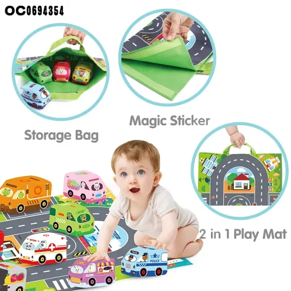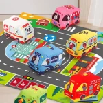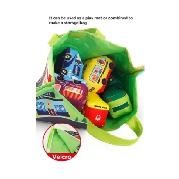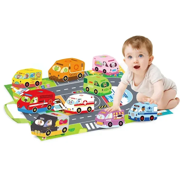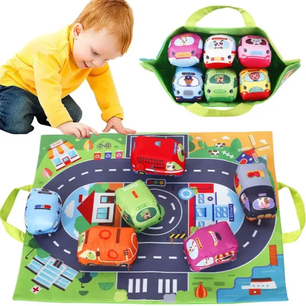 Aceste mașinuțe sunt de diferite forme și dimensiuni și sunt integrate în covor, ceea ce îi atrage pe copii să le exploreze și să le plimbe.