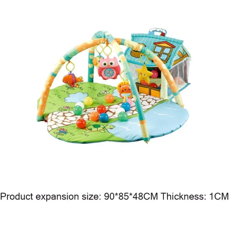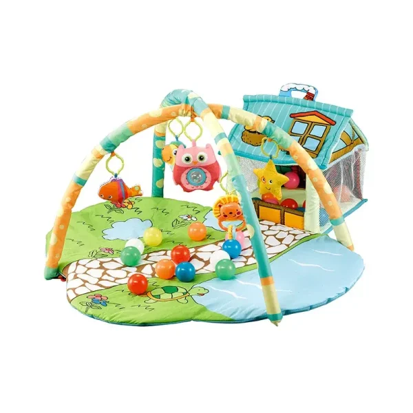 - Arc de jucării suspendate: Include jucării detașabile precum bufnița, peștele și leul, care atârnă pentru a încuraja întinderea mâinilor și dezvoltarea motricității.