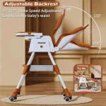 Scaunul este prevăzut cu un spătar ajustabil, care poate fi înclinat în mai multe poziții, inclusiv poziție de somn pentru micuți. Reglarea pe înălțime permite utilizarea scaunului la orice masă, iar suportul pentru picioare oferă un confort suplimentar. Este perfect pentru utilizare de la primele luni până la vârste mai mari.