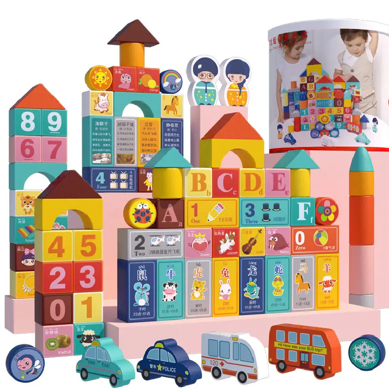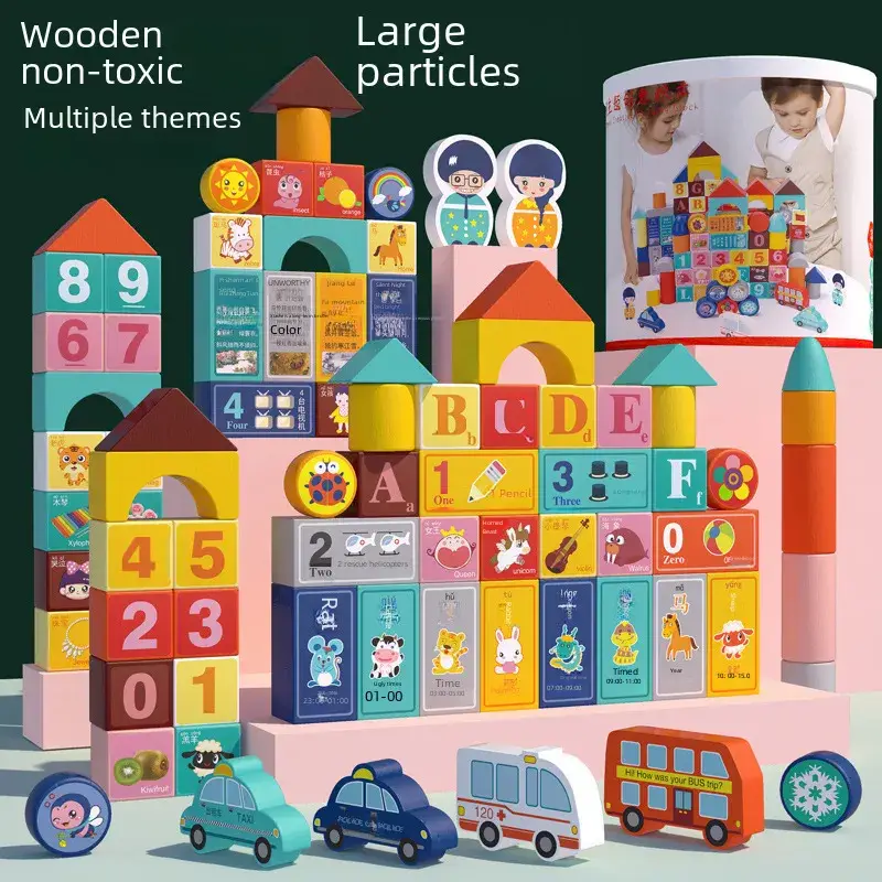 Acest set premium din lemn conține 100 de piese mari, sigure și non-toxice, atent colorate și ilustrate cu litere, cifre, animale, vehicule și tematici educaționale care îi încurajează pe cei mici să descopere lumea prin joacă liberă.