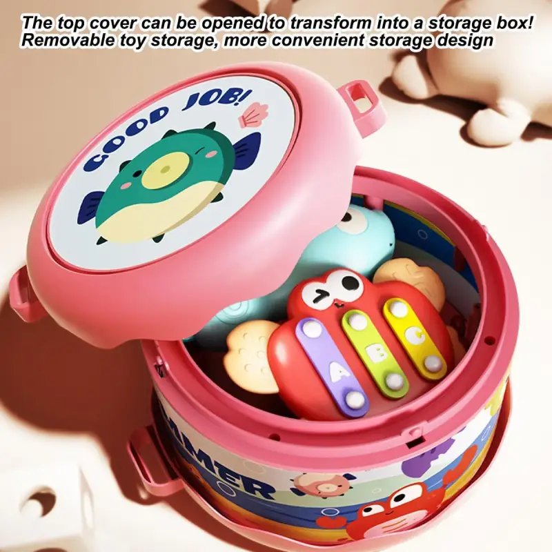 Creat special pentru copiii care adoră să lovească, să exploreze și să creeze, setul include o tobă adorabilă cu design dragalas, instrumente colorate și forme ușor de prins de mâinile mici.