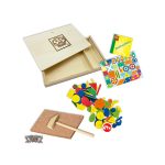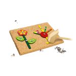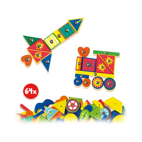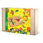 Contine: ciocan de lemn; placa de pluta; matrite din lemn colorate; tepi de metal cu cap rotund; autocolante; instructiuni cu exemple; cutie de depozitare din lemn de lux cu capac glisant.