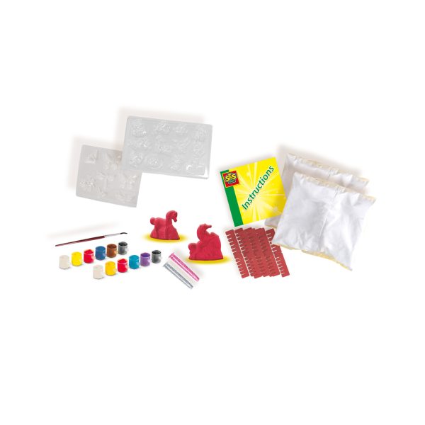 Contine: matrite de turnare pentru flori si fluturi; matrite de turnare pentru caini si pisici; forma de ipsos pentru cresterea cailor; forma de ipsos pentru manz; 2 pungi de praf de modelat (2 x 300gr); sclipici roz; sclipici argintiu; set piepteni; perie; 12 culori de acuarele.