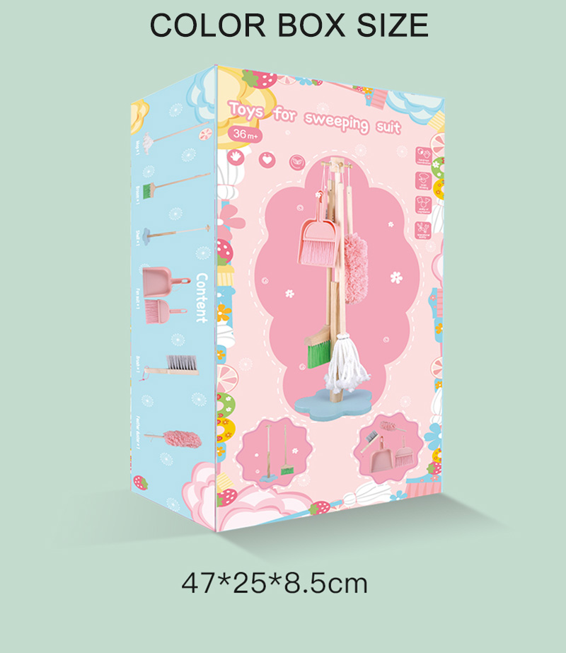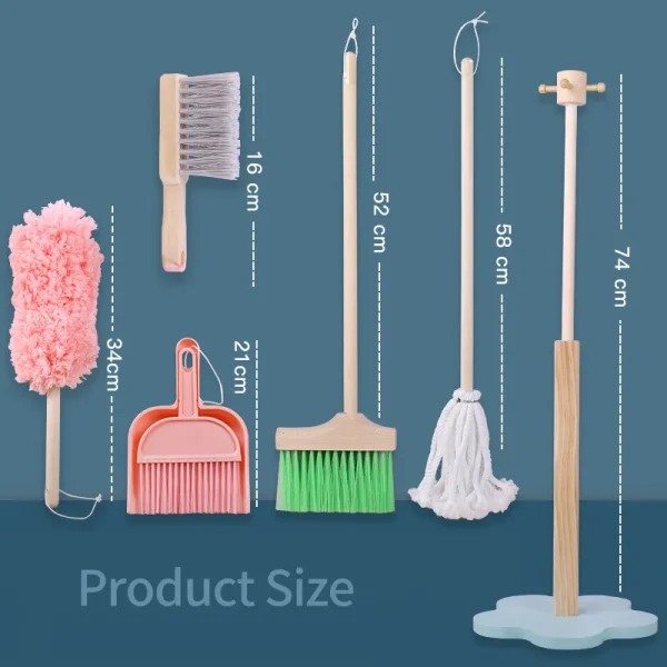 Setul include o mătură de joacă, un mop, un faras, o perie, un pamatuf de praf și un stativ-suport pentru suspendat .