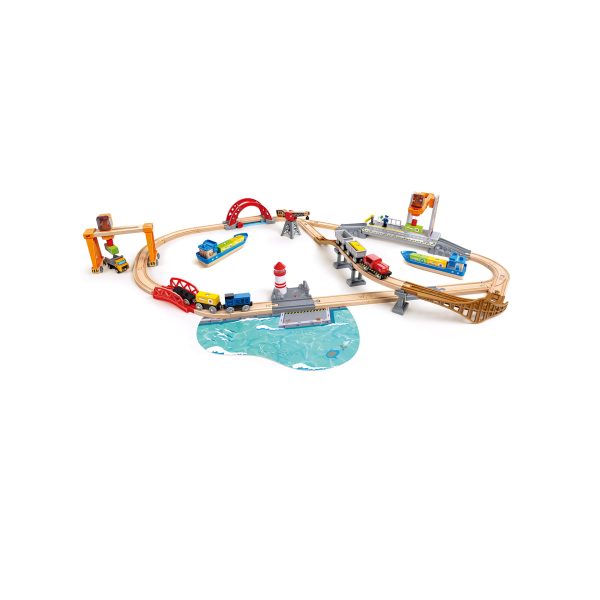 Set de jucarie din lemn – port cu trenuri, vapoare si camioane