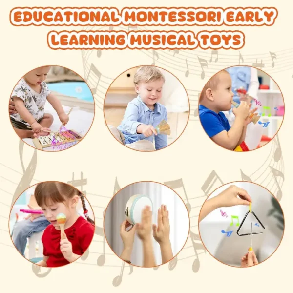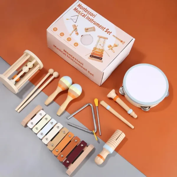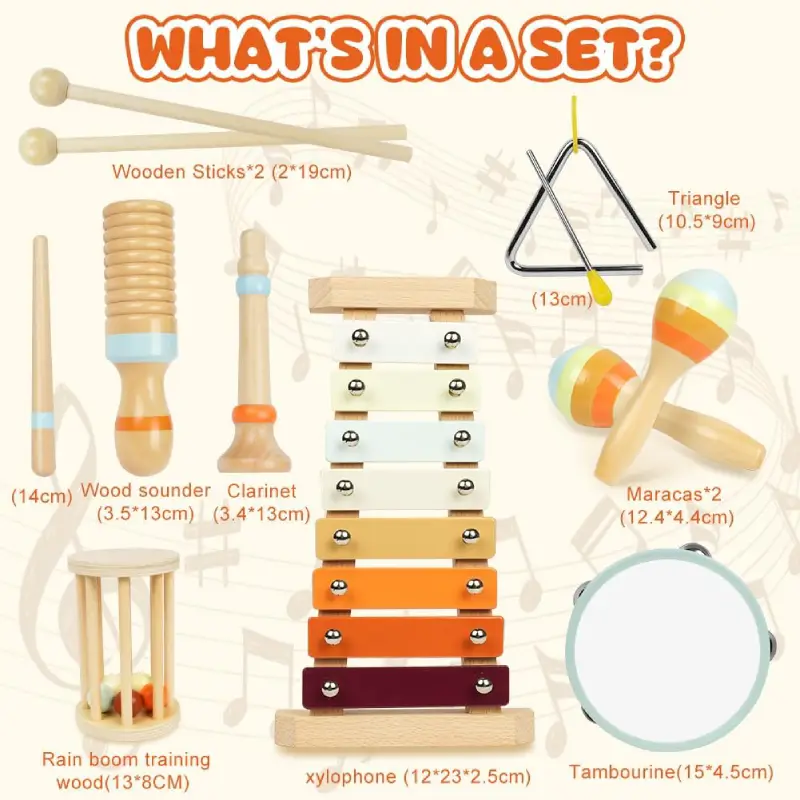 Setul include xilofon, tamburină, maracas, și alte jucării sonore, toate din materiale naturale și sigure.