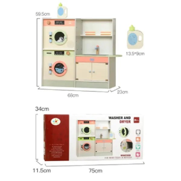 Este un set de joacă din lemn pentru copii, format dintr-o mașină de spălat, un uscător și o chiuvetă, conceput pentru a stimula jocul de rol și învățarea prin activități casnice.