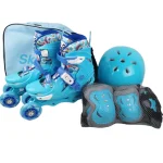 - Setul include o cască, genunchiere, cotiere și protecții pentru încheieturi, toate asortate în culori turcoaz, pentru a oferi protecție completă în timpul patinajului.