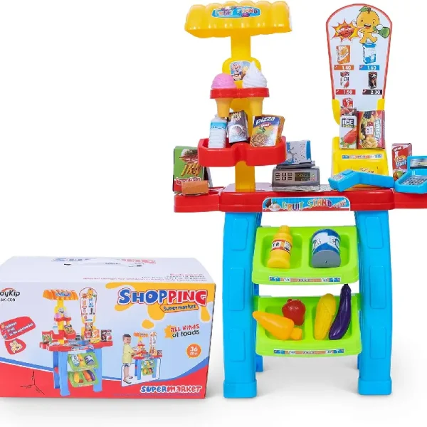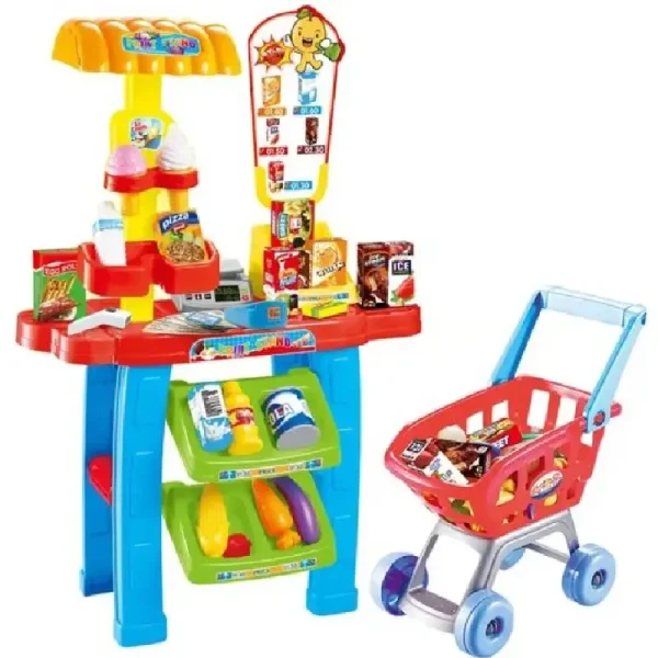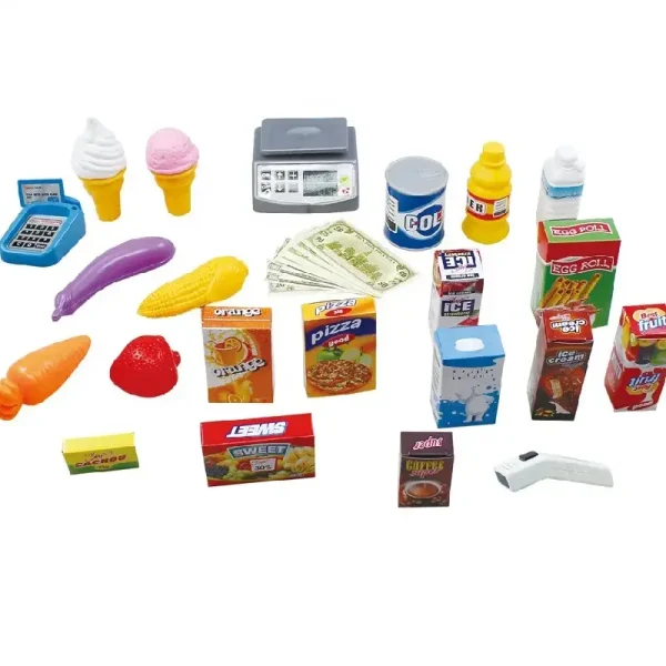 Include tejghea, casă de marcat, scanner, produse alimentare din plastic și multe alte accesorii pentru ore de distracție.