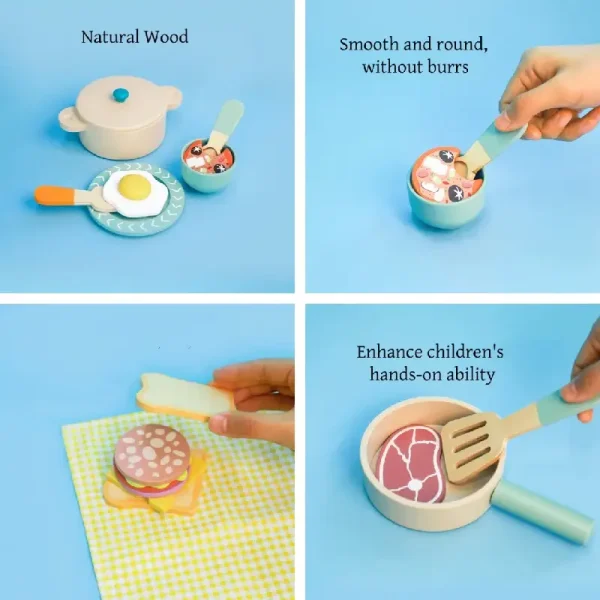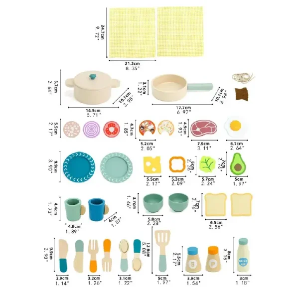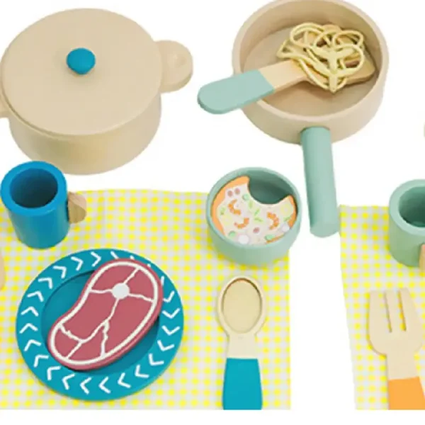 Acest set adorabil din lemn le oferă celor mici ocazia să devină mici maeștri bucătari sau să organizeze un prânz imaginar pentru păpuși, ursuleți sau chiar pentru mami și tati.