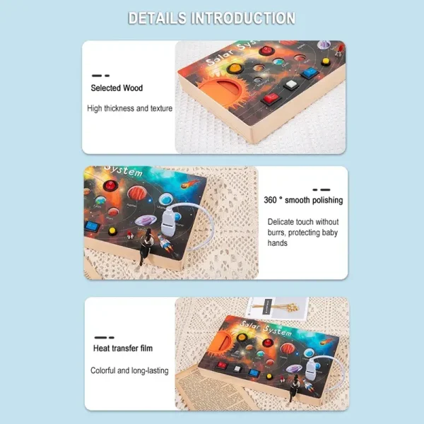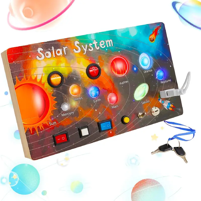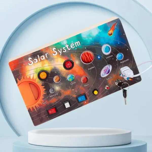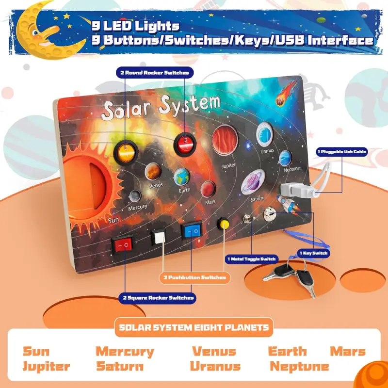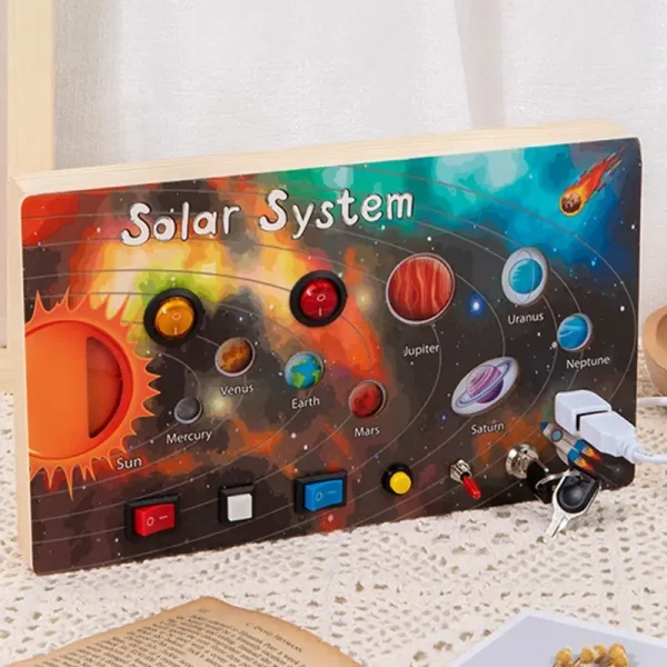 Sistemul Solar Placa Busy Board cu Lumina LED este o jucărie interactivă și educațională care oferă copiilor o varietate de activități senzoriale și cognitive.