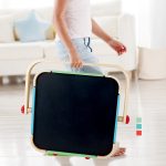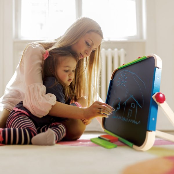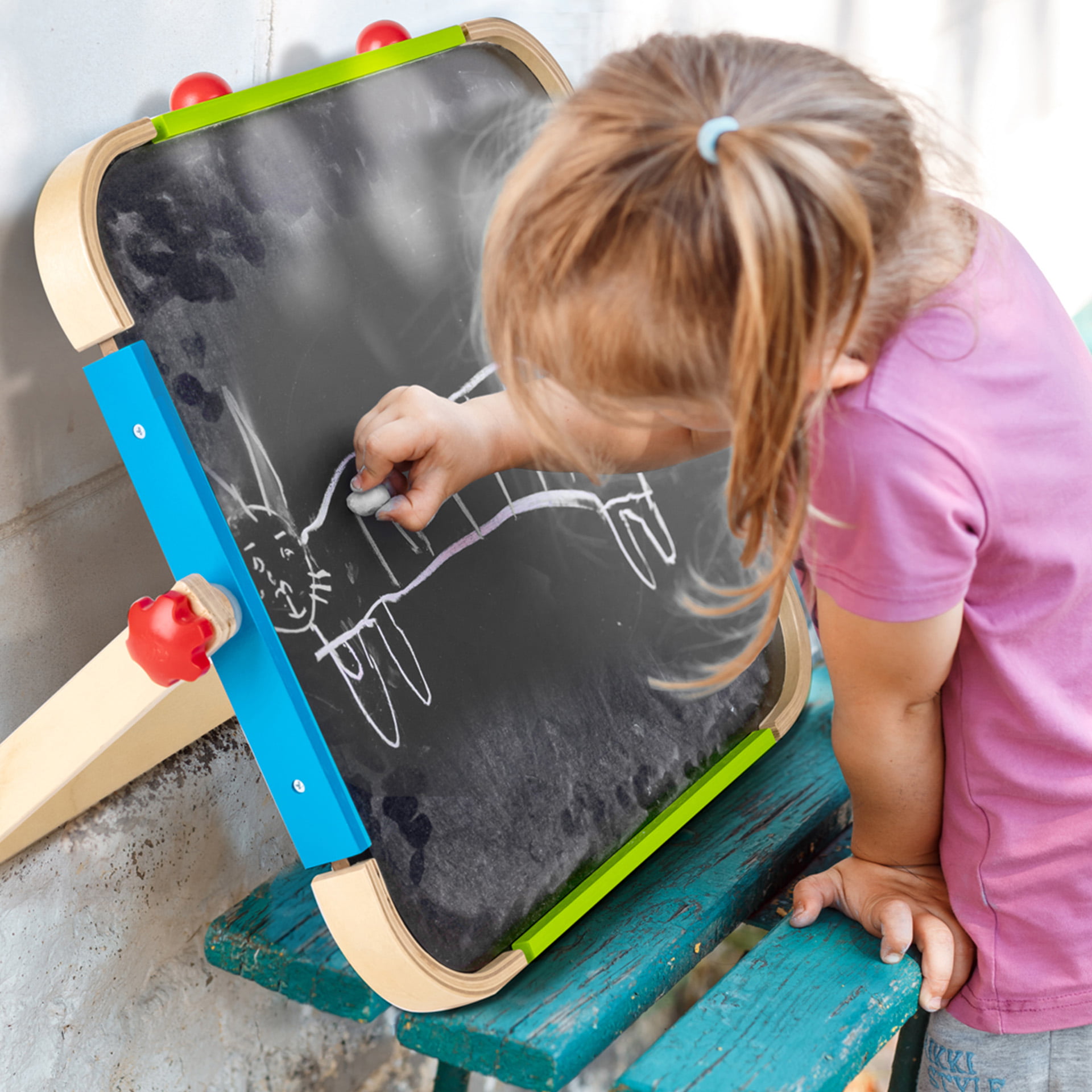 Acest sevalet din lemn este convenabil fata-verso, cu o tabla magnetica pe o parte pentru scris si tabla de sters pe cealalta parte pentru a desena imagini si a colora.