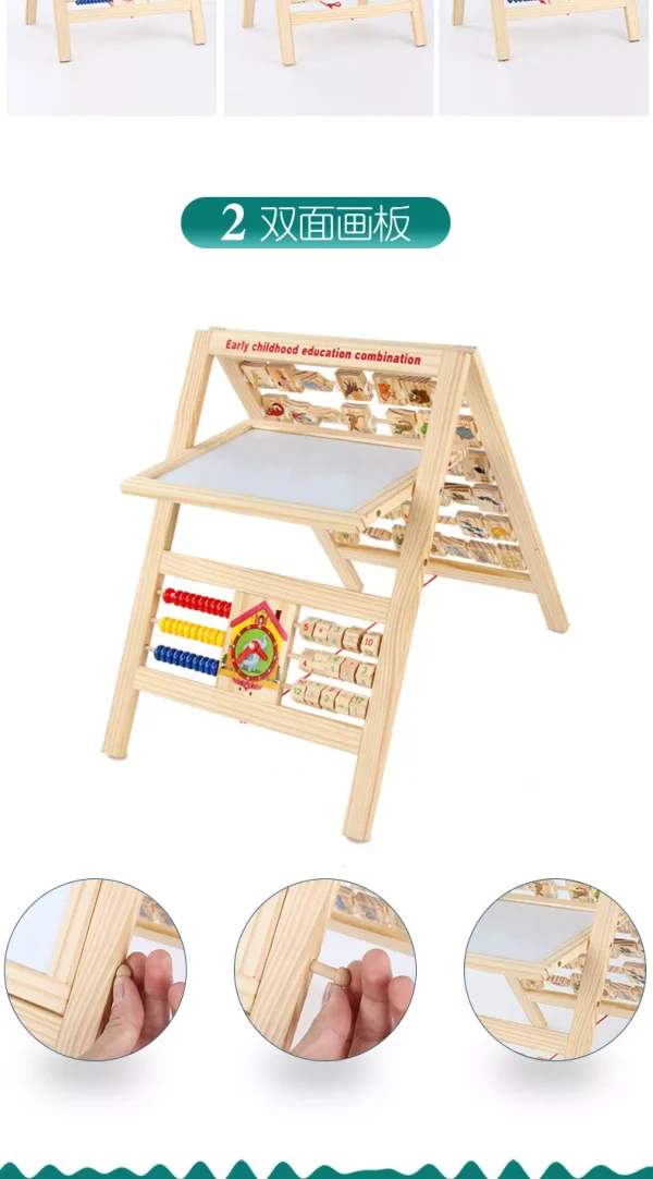 In partea inferioara se afla o numaratoare colorata,un ceas cu limbi mobile si o sectiune de cuburi din lemn pentru calcule matematice.