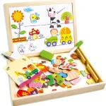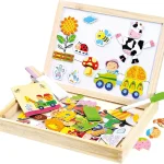 Setul contine piese de puzzle magnetice – cu ajutorul carora isi poate realiza desenul preferat pe tabla alba magnetica.