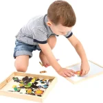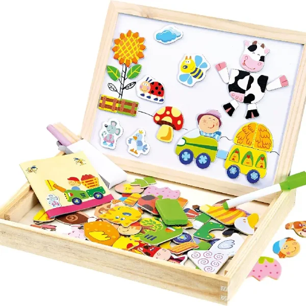 Tablita Magnetica Puzzle 3D Ferma Vesela – O cutie de lemn plină cu piese magnetice din viața de zi cu zi a animalelor de la fermă.