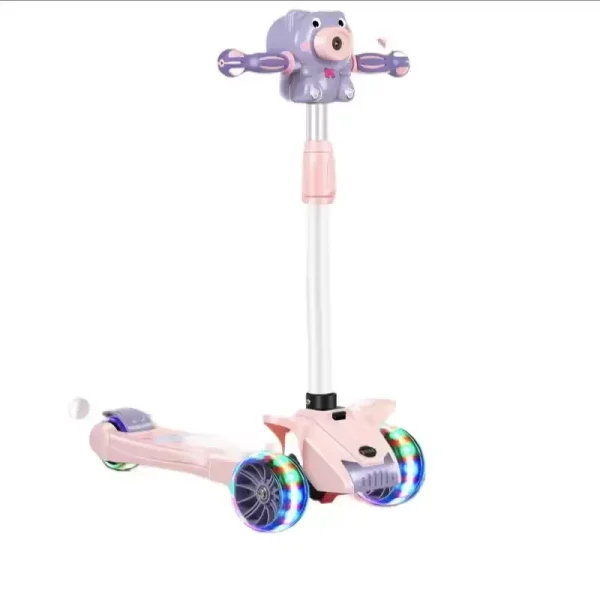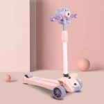 Trotineta Catel Lila cu 3 Roti si Baloane de Sapun este pliabila si are si functie muzicala.