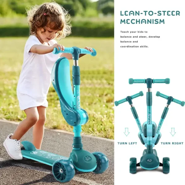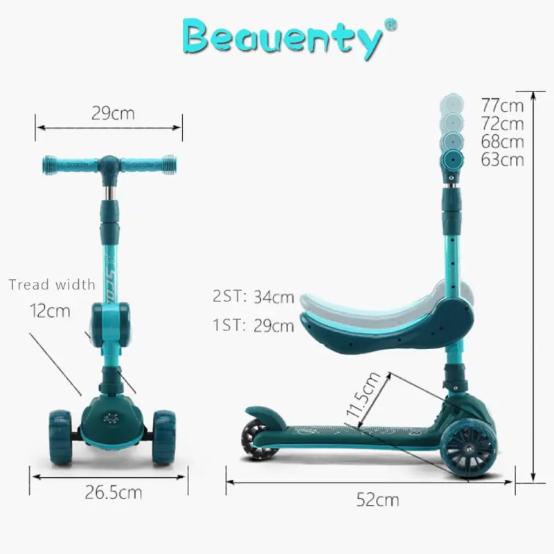 ✔ 2 în 1: Poate fi folosită ca trotinetă clasică, cu scaun sau ca trotinetă pliabilă pentru transport ușor.