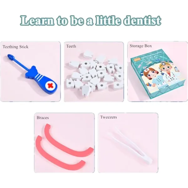 - include o varietate de instrumente medicale de jucărie, precum oglinda stomatologică, sonde, pensete și chiar o jucărie de perie de dinți și pastă de dinți