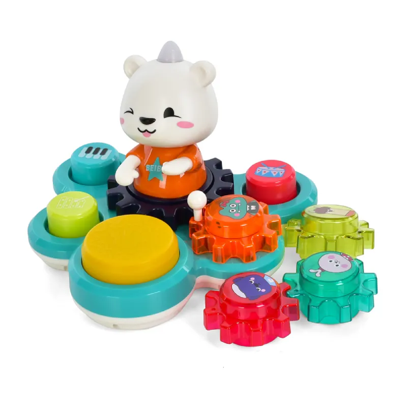 Fiecare dintre cele patru ascund 4 sunete instrumentale, cum ar fi pianul, xilofonul, trompeta și toba. Când capacul roții dintate este ridicat, acestea intră în acțiune. Pe măsură ce bebelușul tău va ridica, va auzi diverse sunete muzicale și va fi încurajat să învețe despre structura tehnică a legăturii angrenajului.