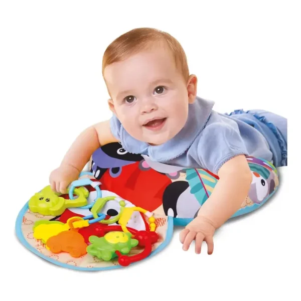 - Jucării interactive atașate – Pernuța include jucării colorate și diverse forme, care încurajează copilul să apuce, să tragă și să exploreze, stimulând coordonarea mână-ochi și motricitatea fină.